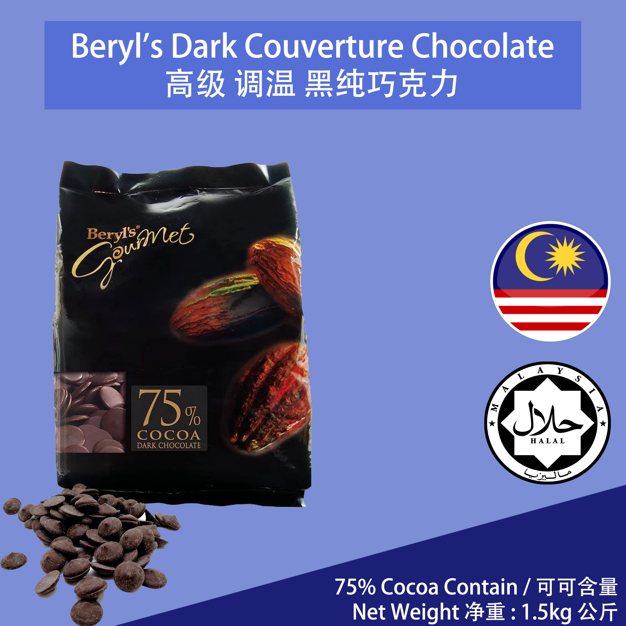 Product Name 产品名称 : Beryl Couverture Dark Chocolate Coin 75% 1.5kg / Coklat Hitam Syiling 高级 黑巧克力 / 调温 纯巧克力