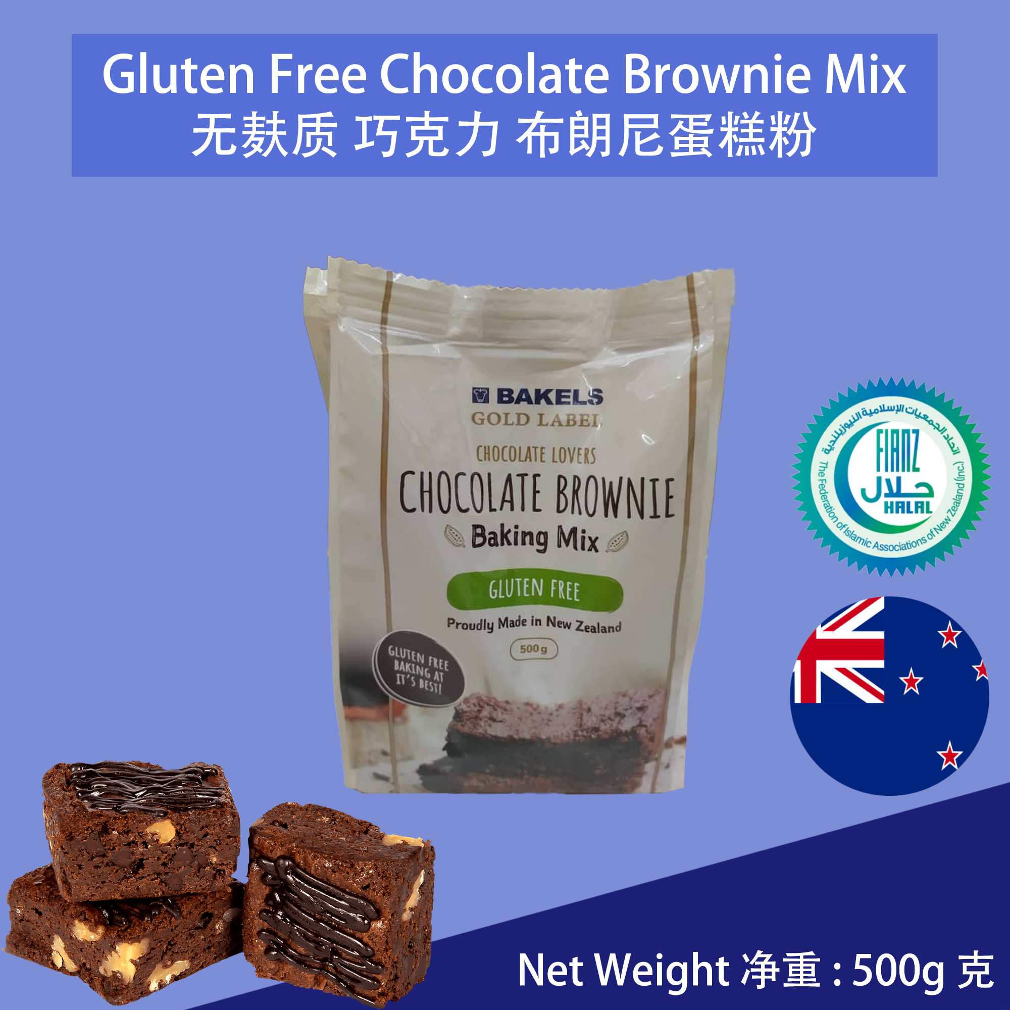 This premium gluten-free chocolate brownie cake mix is sourced directly from New Zealand, ensuring top quality for your baking needs. 此款优质无麸质巧克力布朗尼蛋糕粉原装进口自新西兰,品质卓越,满足您的烘焙需求。