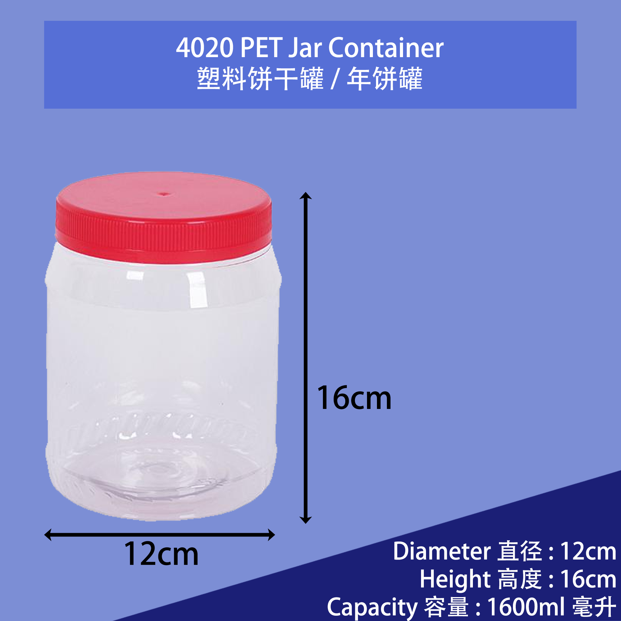 Product Name 产品名称 : Plastic PET Jar Container / 塑料PET罐容器 Code 代号 : 4020 Size Dimension 尺寸 : 120mm x 160mm (Diameter 直径 x Height 高度) Capacity 容量: 1600ml