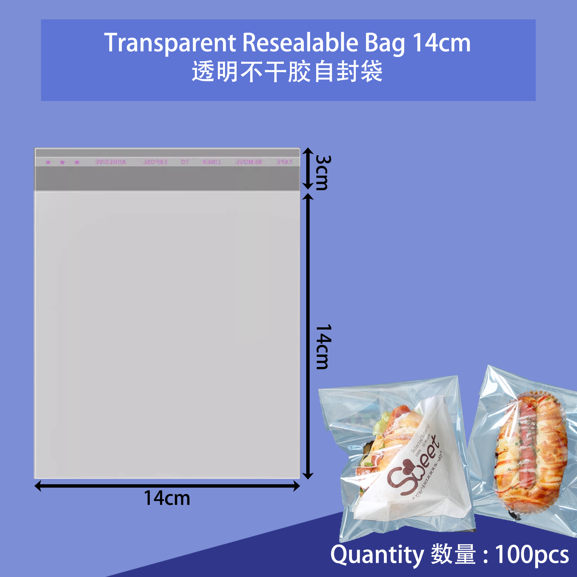 1. After tape size for the bag will be 14cm x 14cm. 在粘上贴纸封口后会变成14cm x 14cm的尺寸