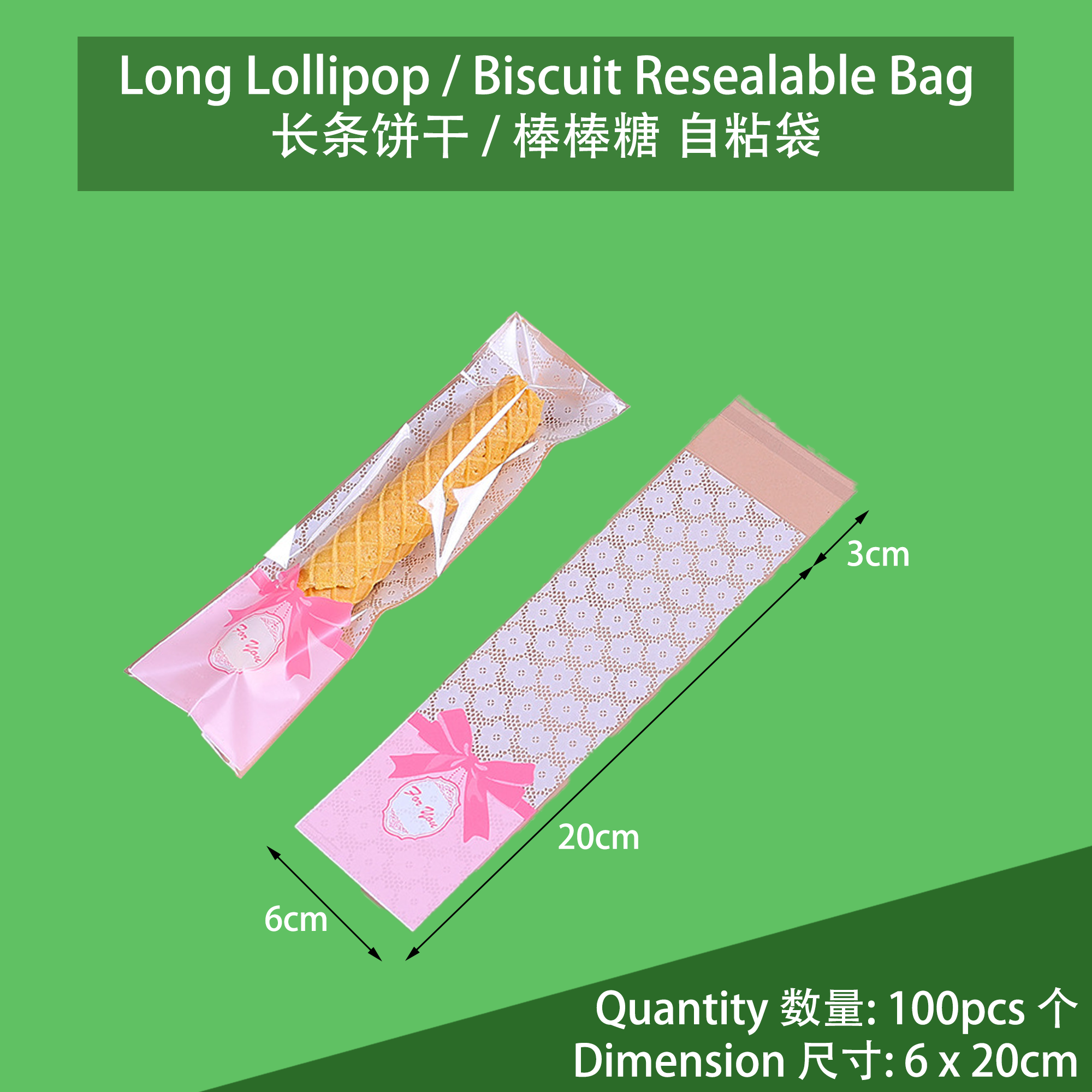 Product Name 产品名称 : Long Lollipop Biscuit Resealable Bag 长条形 棒棒糖/饼干 自粘包装袋
