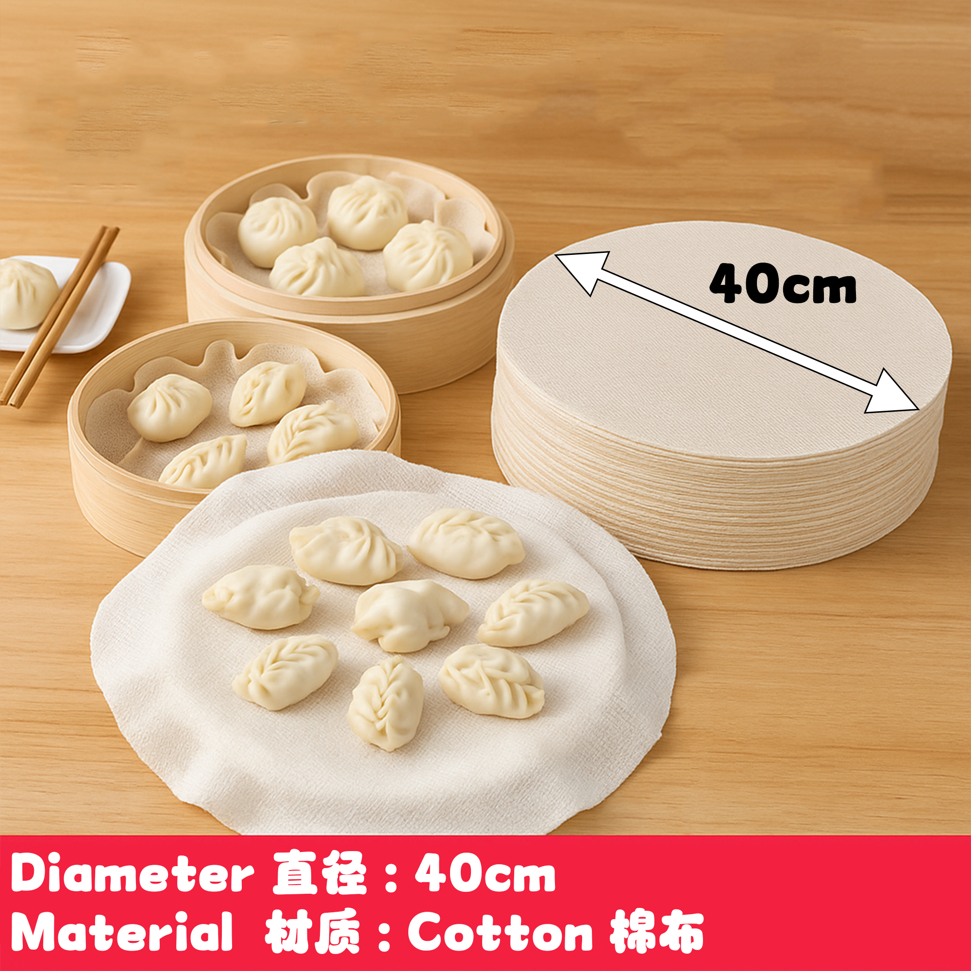 Enjoy hassle-free steaming with this non-stick cotton steamer cloth, perfect for buns, dumplings, mantou, and more / Nikmati proses kukus yang mudah tanpa melekat dengan kain kukus kapas ini, sesuai untuk pau, ladu, mantou dan sebagainya / 使用这款不粘棉纱蒸笼布,轻松蒸煮包子、饺子、馒头等,告别粘底烦恼。