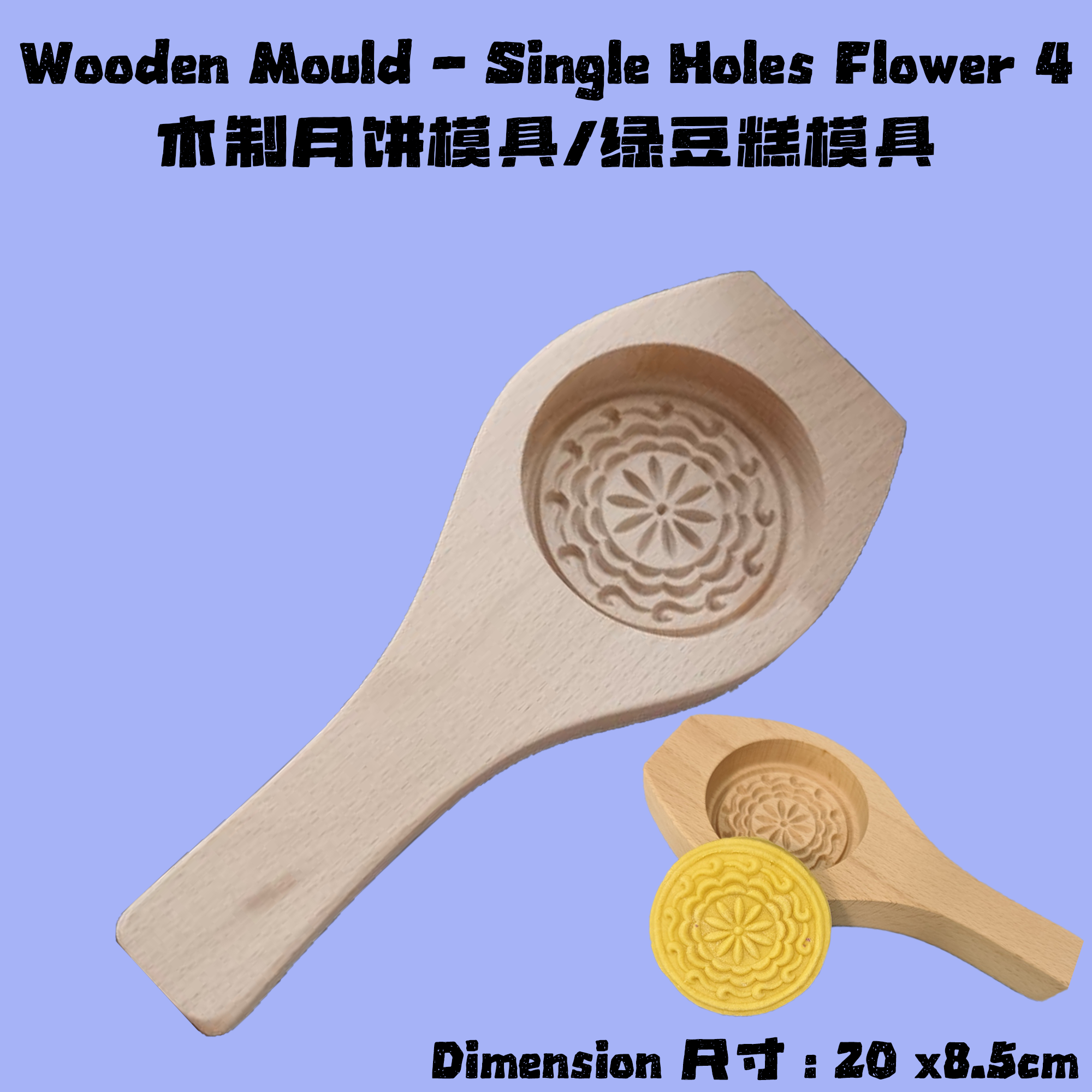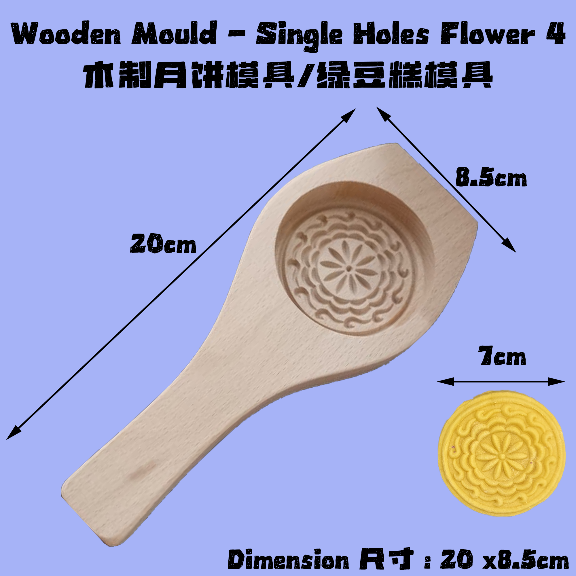 - Traditional Design 传统设计 : Features a beautifully carved single flower pattern, perfect for creating elegant and festive mooncakes or traditional kuih. 精美的雕刻花朵图案,非常适合制作月饼或传统糕点。
