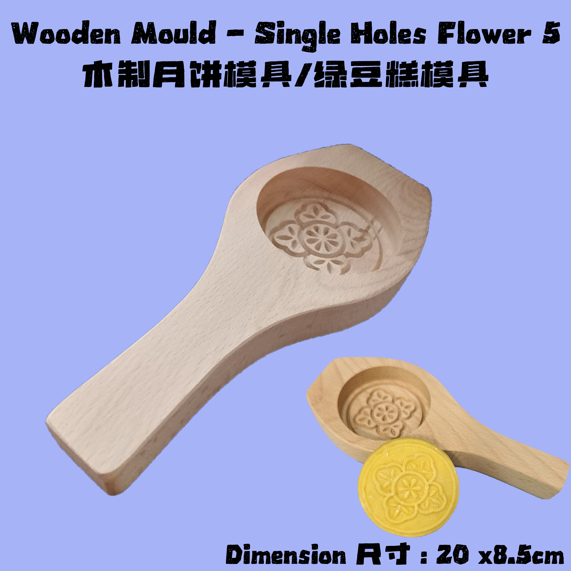 - Traditional Design 传统设计 : Features a beautifully carved single flower pattern, perfect for creating elegant and festive mooncakes or traditional kuih. 精美的雕刻花朵图案,非常适合制作月饼或传统糕点。