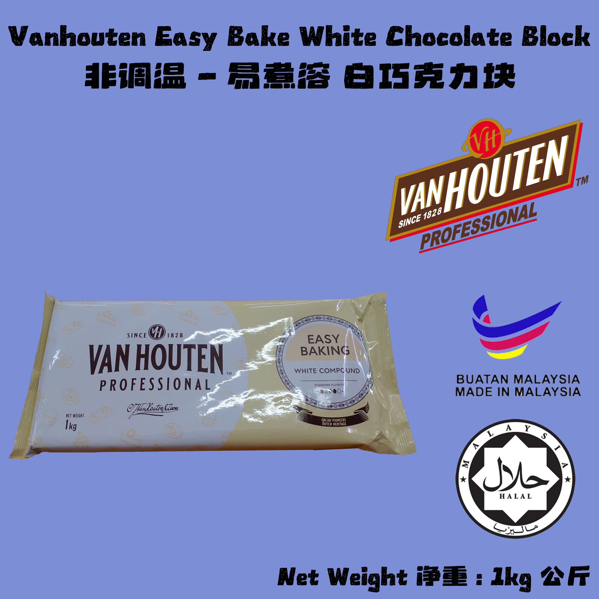 Product Name : Van Houten Easy Baking White Compound Chocolate Block 易煮溶 块状白巧克力 Net Weight 净重 : 1000g 克
