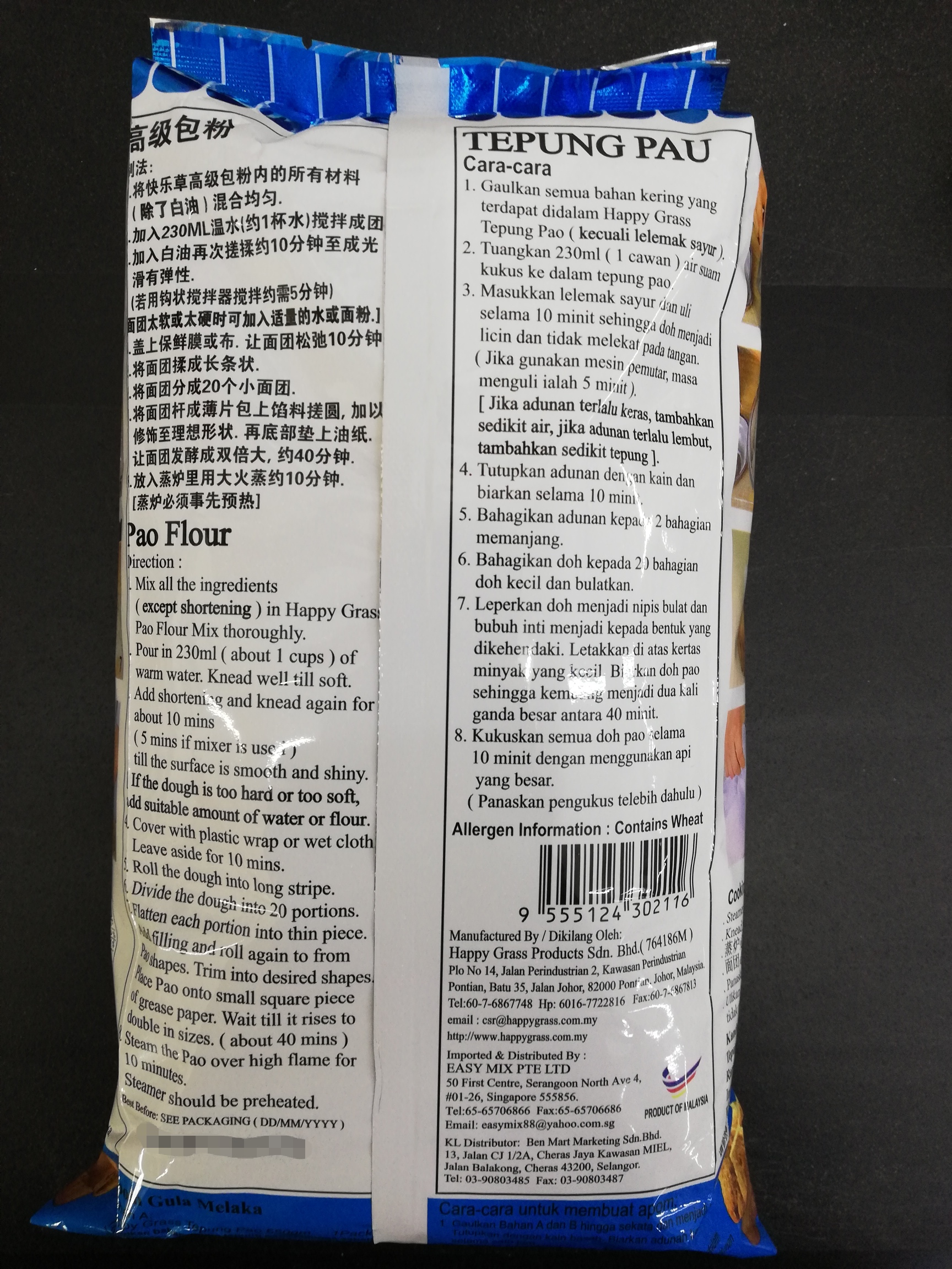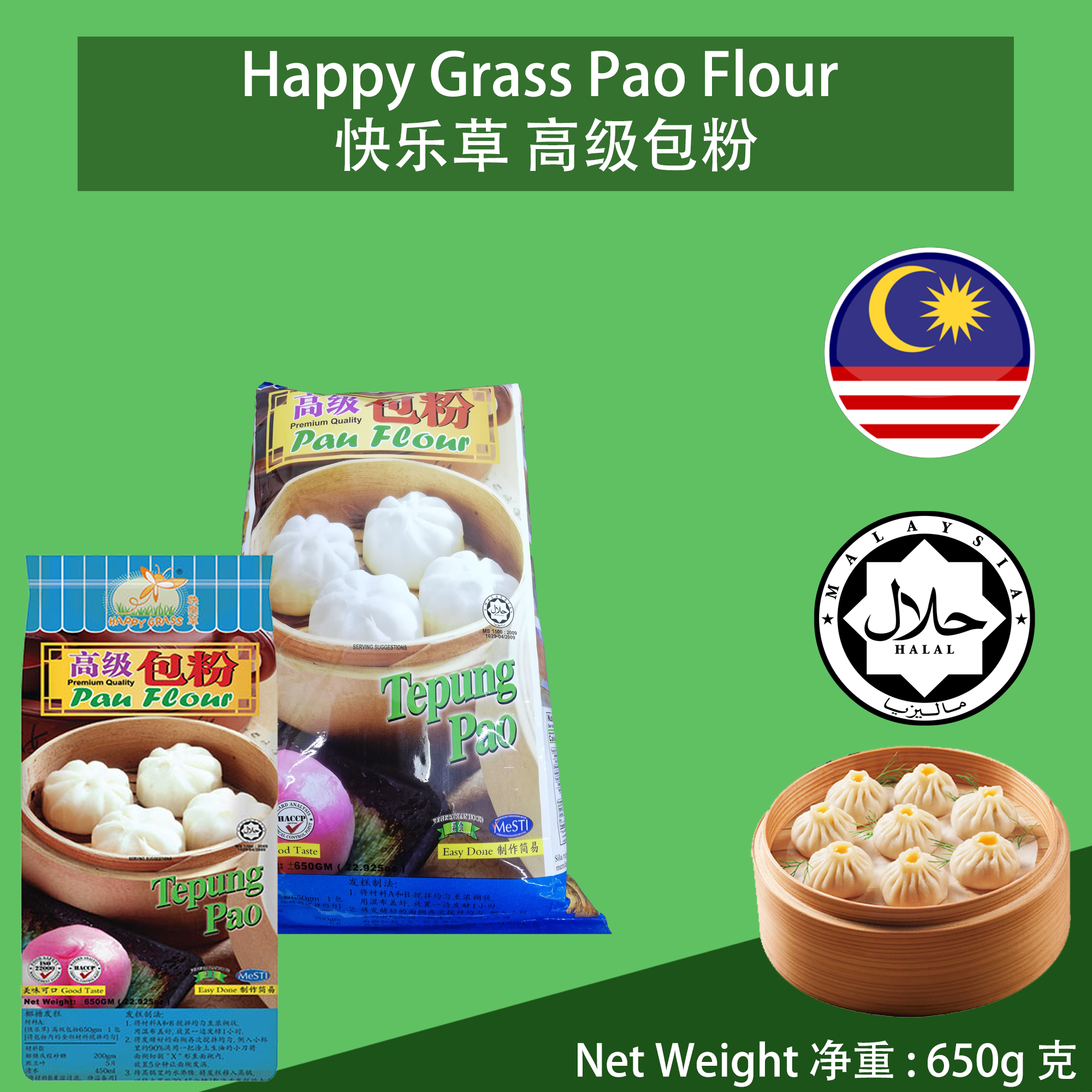 Made in Malaysia 马来西亚本地产品: Proudly produced in Malaysia, Happy Grass Pao Flour delivers high quality and authentic local flavor for your bao-making needs. 这款包粉由马来西亚生产,提供高品质和正宗的本地风味,完美满足您的包子制作需求。