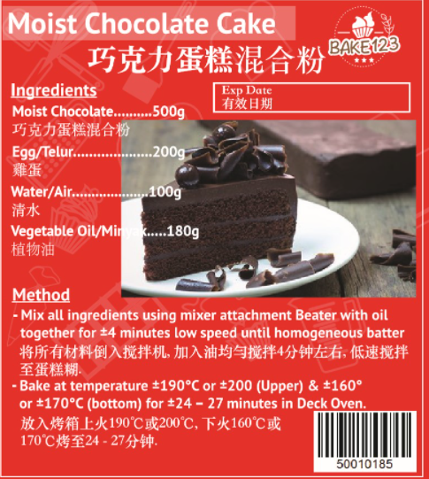 Moist Chocolate Cake Mix is specially formulated to produce soft, rich, and moist chocolate cakes with a deep cocoa flavour. It provides consistent results and saves preparation time, making it ideal for both home bakers and professionals. Just add eggs, oil, and water — and enjoy a delicious chocolate cake every time.