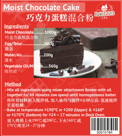 Moist Chocolate Cake Mix is specially formulated to produce soft, rich, and moist chocolate cakes with a deep cocoa flavour. It provides consistent results and saves preparation time, making it ideal for both home bakers and professionals. Just add eggs, oil, and water — and enjoy a delicious chocolate cake every time.